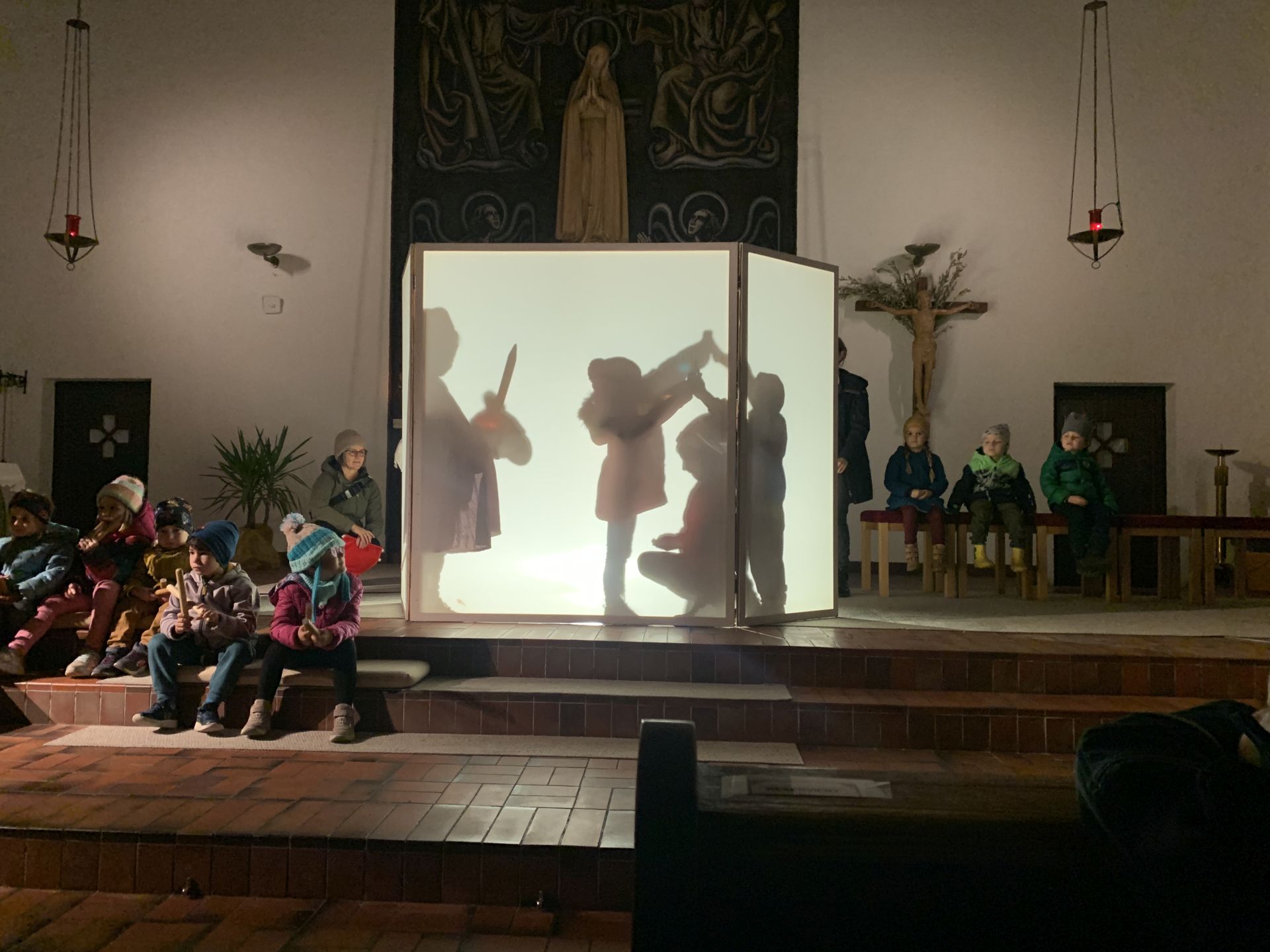 Schon Wochen vor dem Fest wurden fleißig wunderschöne Laternen gebastelt sowie Lieder und Gedichte gelernt. Am 09.11.2023 war es dann soweit. Leuchtende Kinderaugen trafen zur Dämmerung im Kindergarten ein, wo sie mit Musik und Kerzenschein in Empfang genommen wurden. Zur Stärkung gab es dann eine Sternensuppe und eine kleine Süßigkeit. Wie in einem Lichtermeer gingen dann alle Gruppen gemeinsam zur Kirche Herz Mariae. Alle Eltern und Geschwister warteten dort schon gespannt auf die Kinder mit ihren leuchtenden Laternen. Sabrina, unsere Gemeindeleiterin, führte dann durch das Fest. Die Kinder durften ihre gelernten Lieder und das Gedicht vorstellen. Unsere Fröschlegruppe sorgte mit ihrem bezaubernden Schattenspiel für ein zusätzliches Highlight.