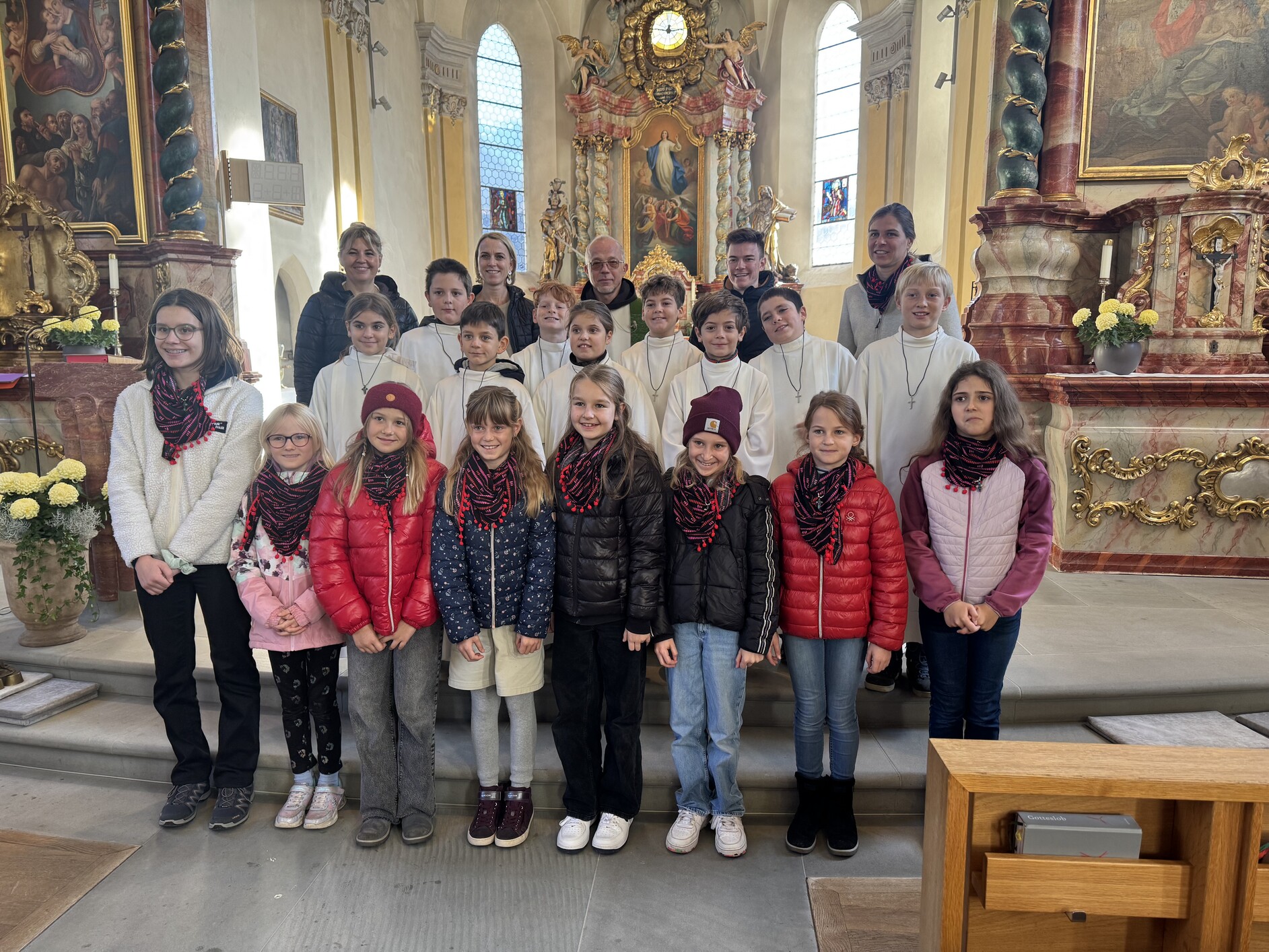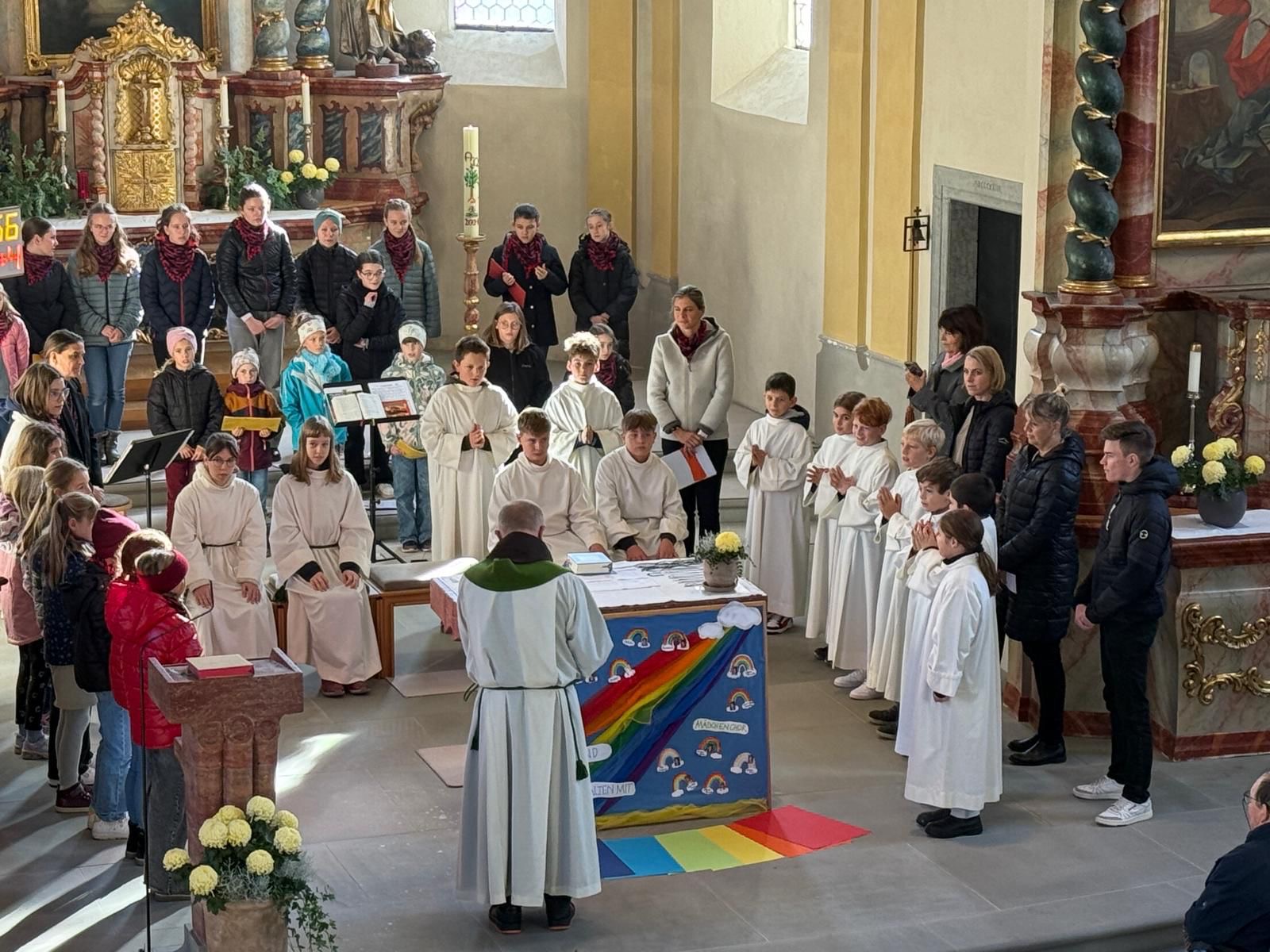 Während der Aufnahmefeier hob Pater Guido hervor, dass die Kinder seit dem Tag der Erstkommunion ganz zur Gemeinschaft der Getauften gehören und Jesus besonders die Nähe zu Kindern sucht. Die neuen Sängerinnen und Minis legten das Versprechen ab, ihre Aufgaben gewissenhaft und Gott zur Ehre zu erfüllen. Im gemeinsamen Gebet wurde die Gemeinschaft gestärkt, die wie ein bunter Regenbogen über unserer Pfarre leuchten soll. Als Erinnerung haben die Kinder gesegnete Kettchen mit Kreuzanhänger erhalten, die sie auf ihrem Weg mit Jesus begleiten.