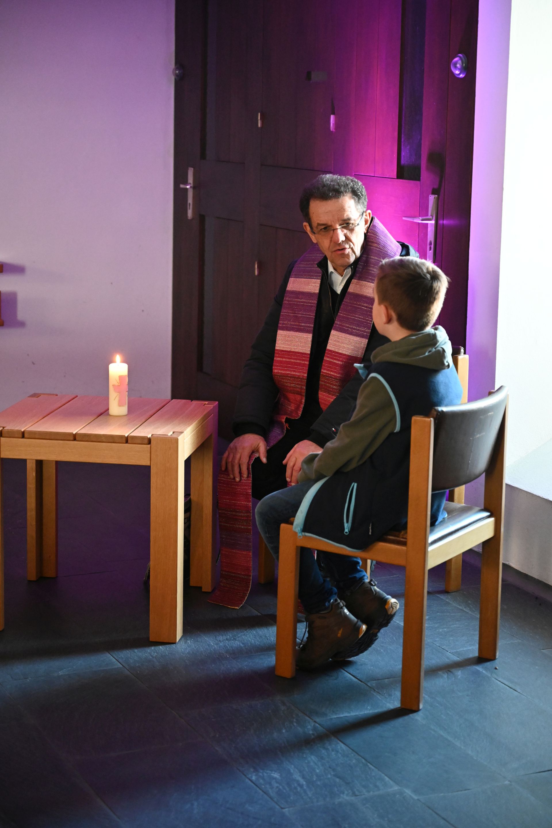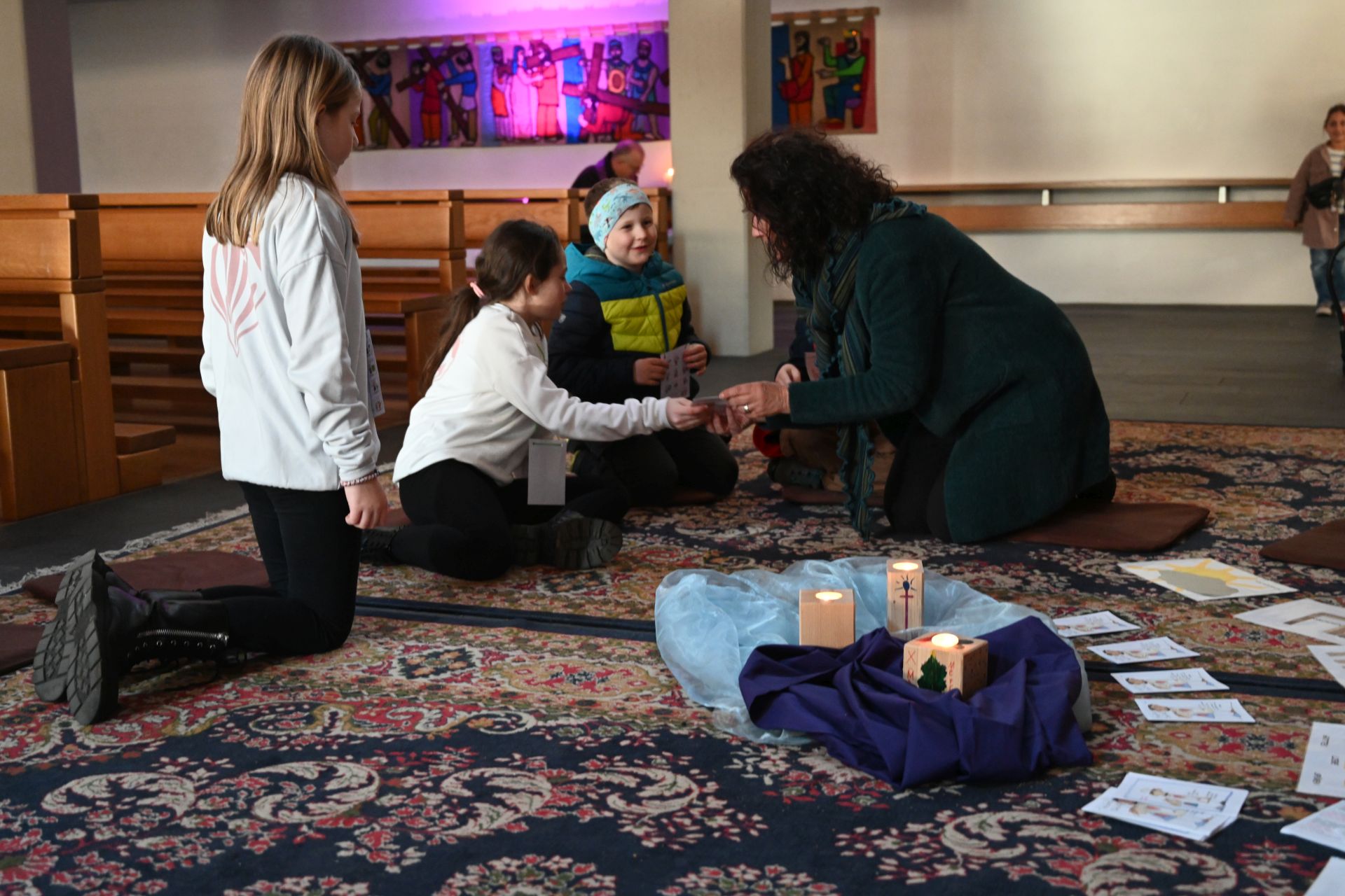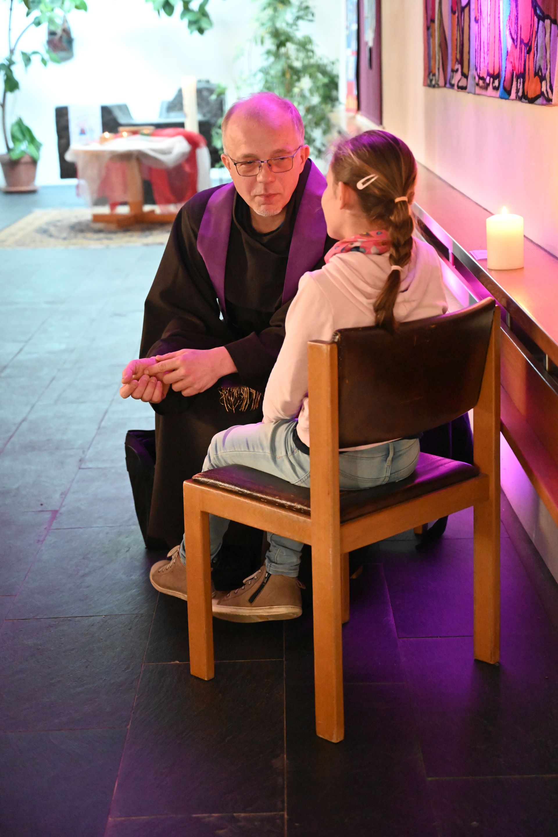 An unterschiedlichen Stationen konnten sich die Kinder mit dem breiten Themenfeld „Versöhnung“ auseinandersetzen. Sei es beim Basteln eines Gebetswürfels, beim Zuhören der Geschichte „Der rote Faden“, bei einer Schatzsuche oder beim gemeinsamen Singen. Auch eine kleine Vorbereitung auf die Beichte und die Beichte selbst waren Teil des Stationsbetriebs, der von den Seelsorgeraum-Verantwortlichen sowie zahlreichen Ehrenamtlichen liebevoll gestaltet wurde. „Das offene Angebot ist uns dabei sehr wichtig“, erläutert Pastoralleiter Thomas Folie und beschreibt: „Die Priester sitzen im offenen Kirchenraum für die Kinder gut sichtbar. So kann sich jedes Kind ‚seinen‘ Priester für die Beichte selbst aussuchen.“